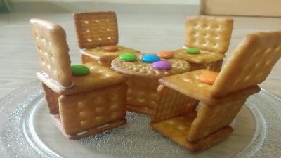 ३. बिस्किटचा सोफा सेट बनविण्याची ही एक सगळ्यात सोपी आयडिया. अगदी १० ते १५ मिनिटांत हा सेट तयार होतो. बिस्किटे, गोळ्या, खालचा बेस आणि डिंक एवढ्याच साहित्यात हा सेट तयार.