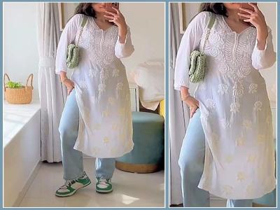 स्ट्रेट फिट जीन्सवर चिकनकारी वर्क असणाऱ्या कुर्ती घातल्या तर खूप सुंदर दिसतात.