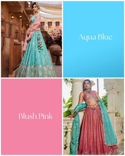 ॲक्वा ब्लू (Aqua Blue) आणि ब्लश पिंक (Blush Pink) हे कॉम्बिनेशन म्हणजे जणू 'स्वप्नातल्या परीसारखा' लूक! हे रंग अतिशय शांत, सुखद आणि डोळ्यांना थंडावा देणारे आहेत. विशेषतः उन्हाळ्यातील लग्नासाठी किंवा डे-वेडिंग साठी हे सर्वात ट्रेंडी कॉम्बिनेशन मानलं जातं. जर तुम्हाला जास्त गडद किंवा भडक रंग आवडत नसतील, तर हे 'पेस्टल फ्युजन' तुमच्यासाठी सर्वोत्तम आहे. अक्वा ब्लूचा थंड, शांत टोन आणि ब्लश पिंकचा नाजूक, सॉफ्ट शेड एकत्र आल्यावर लुक खूपच सोज्वळ आणि फोटोजेनिक दिसतो. हलक्या निळ्या रंगाचा फ्लोरल किंवा नेटचा लेहेंगा आणि त्यावर नाजूक ब्लश पिंक रंगाची नेटची ओढणी तुम्हाला एखाद्या राजकन्येसारखा लूक देते. या हलक्या रंगांवर पांढऱ्या धाग्यांची 'चिकनकारी' किंवा चांदीचे 'सिक्वेन्स वर्क' खूप सुंदर दिसते.