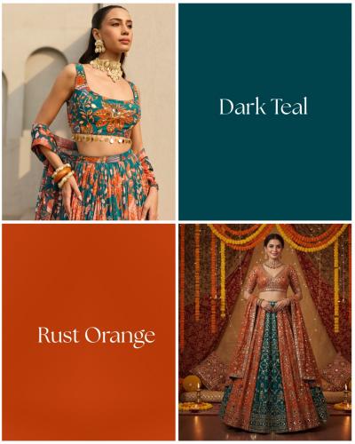 डार्क टील (Dark Teal) आणि रस्ट ऑरेंज (Rust Orange) हे एक अत्यंत युनिक आणि 'अँटिक' वाटणारं कॉम्बिनेशन आहे. जर तुम्हाला गर्दीत वेगळं दिसायचं असेल आणि पारंपारिक लाल-हिरव्या रंगांपेक्षा काहीतरी हटके हवं असेल, तर हे कॉम्बिनेशन तुमच्यासाठी परफेक्ट आहे. हे कॉम्बिनेशन विशेषतः अशा मुलींसाठी आहे ज्यांना 'विंटेज' किंवा 'बोल्ड' लूक आवडतो. डार्क टील रंगाचा घेरदार लेहेंगा आणि त्यावर रस्ट ऑरेंज रंगाचा ब्रोकेड किंवा सिल्क ब्लाऊज अतिशय 'रिच' दिसतो. हे कॉम्बिनेशन नाईट फंक्शन, लग्न किंवा रिसेप्शनसाठी उत्तम आहे. पूर्ण लेहेंगा आणि ब्लाऊज डार्क टील ठेवा आणि त्यावर एक भरजरी रस्ट ऑरेंज रंगाची बांधणी किंवा पटोला ओढणी घ्या. यामुळे एक सुंदर कॉन्ट्रास्ट तयार होतो. जर डार्क टील लेहेंग्यावर रस्ट रंगाच्या धाग्यांनी नक्षीकाम केलं असेल, तर तो लेहेंगा अधिकच क्लासी वाटतो.