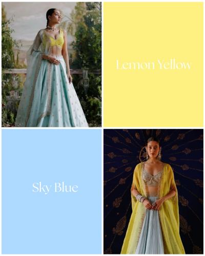 लेमन यलो (Lemon Yellow) आणि स्काय ब्लू (Sky Blue) हे कॉम्बिनेशन अत्यंत फ्रेश, व्हायब्रंट आणि उन्हाळ्यातील लग्नांसाठी सर्वात जास्त पसंती दिले जाणारे पेस्टल कॉम्बिनेशन आहे. जर तुम्हाला जड आणि गडद रंगांचा कंटाळा आला असेल आणि तुम्हाला लग्नात 'लाईटवेट' पण 'आय-कॅची' दिसायचे असेल, तर या दोन रंगांची निवड करा. हे कॉम्बिनेशन चेहऱ्यावर एक वेगळीच चमक आणते आणि फोटोंमध्ये अतिशय सुंदर दिसते. पिवळ्या रंगाच्या लेहेंग्यावर आकाश निळ्या रंगाचा एम्ब्रॉयडरी असलेला ब्लाऊज तुम्हाला गर्दीत वेगळे पाडेल. स्काय ब्लू रंगाचा नेट किंवा ऑर्गन्झा लेहेंगा आणि त्यावर लेमन यलो रंगाची हलकी ओढणी घेतल्यास तुम्ही एखाद्या परीसारख्या दिसाल. या दोन्ही फिकट रंगांवर 'मिरर वर्क' अतिशय सुंदर दिसते. प्रकाशात जेव्हा हे आरसे चमकतात, तेव्हा लेहेंग्याचा लूक अधिकच प्रीमियम वाटतो.