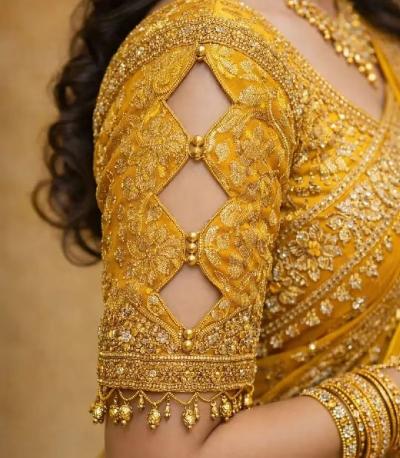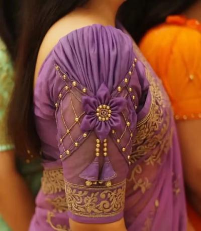 एखाद्या भरजरी किंवा सिल्क साडीसाठी फुलांच्या नक्षीच्या बाह्या अतिशय रॉयल दिसतात. यावर हाताने बनवलेले सुंदर गोंडे (Tassels), मोती आणि मण्यांचे काम केल्यास तुमच्या सौंदर्यात अधिक भर पडते. हे डिझाईन खास करून लग्नसमारंभासाठी परफेक्ट आहे.