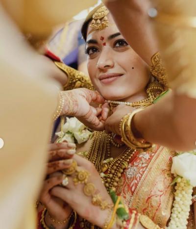 रश्मिका मंदानाचं मंगळसूत्र हे खूपच युनिक होतं. ज्वेलर्सकडून व्यवस्थित डिझाईन करून घेतलेलं हे मंगळसूत्र होतं. यात अधुनिकता आणि पारंपारीकता यांचा संगम होता. (Rashmika's Unique Gold Mangalsutra)