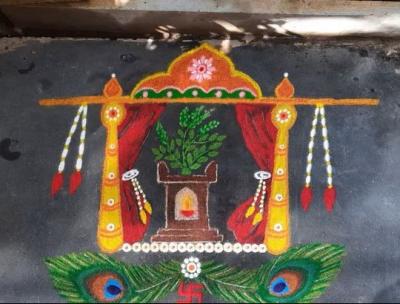 तुळस आणि तिची निघालेली डोली.. असं भासवणारी ही आणखी एक मस्त रांगोळी..