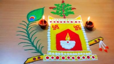 तुळशीच्या आजूबाजूला तुम्ही बासरी आणि मोरपिसाची रांगोळी काढू शकता.