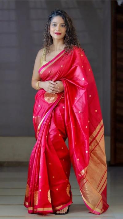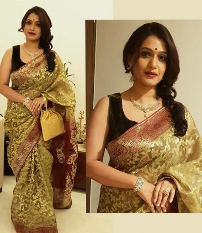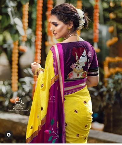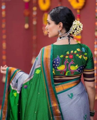 सणवाराला नेसण्यासाठी हे पॅटर्न उत्तम आहे. तर तुमच्या साडीचं ब्लाऊज प्लेन असेल तर तुम्ही हे नक्षी असलेले ब्लाऊज वेगळे विकत घेऊ शकता.