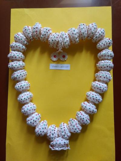 हा एक देखणा प्रकार. यामध्ये फुलवातीप्रमाणे आधी आकार देऊन घेतला आणि मग तो एकात एक गुंफला. एखाद्या कागदाच्या घडीवर कापूस चिटकवून तुम्ही ही वस्त्रमाळ करू शकता.