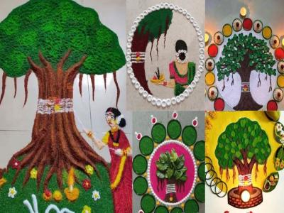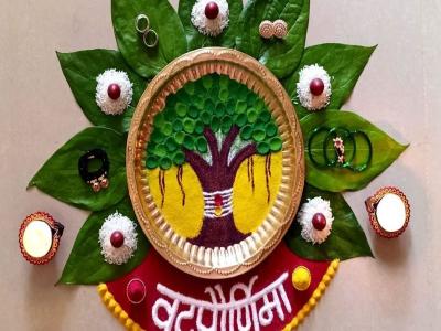 याचप्रमाणे आपण वडाच्या झाडाच्या पूजेसाठी थाळी तयार करतो, पूजेसाठी लागणाऱ्या साहित्याचा वापर करून देखील आपण अशी नेहमीपेक्षा वेगळी पण रेखीव अशी रांगोळी काढू शकतो.