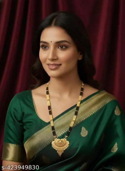 सिल्क किंवा कांजीवरम सांडी अशी साड्यांवर लांब सरीचे किंवा टेंपल ज्वेलरी धाटणीचे मंगळसूत्र उठून दिसते.