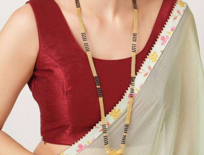 जर साडीचा गळा मोठा असेल तर आखूड मंगळसूत्र निवडावे. जर गळा बंद असेल तर लांब मंगळसूत्र अधिक चांगले दिसते.