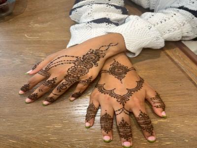 परिनीती चोप्रा हिनेही साधी आणि नाजूक मेहेंदी काढली होती. तिच्या डिझाइनमध्ये सूक्ष्म फुलांचे आणि पारंपरिक मोटिफ्सचे छोटे नमुने होते, पण संपूर्ण हात व्यापणारी मेहेंदी नव्हती.