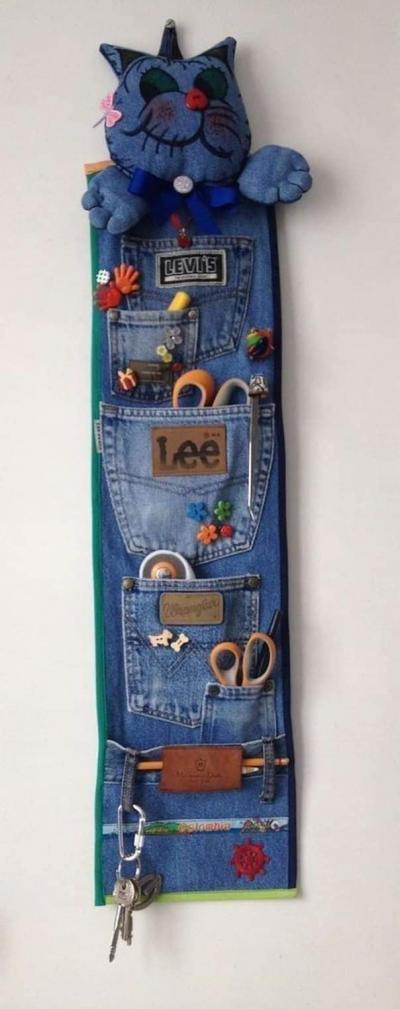 जीन्सला अनेक खिसे असतात. आपण त्या खिश्यांपासून किल्ली स्टँड बनवू शकता. ते सर्व खिसे एकाच कापडावर एकत्रितपणे जोडून आपण खास किल्ली स्टँड बनवू शकता, यासह मोबाईल स्टॅंडदेखील बनवू शकता.
