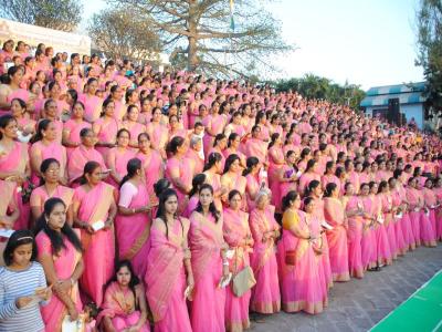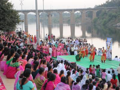 गुलाबी रंगाच्या साड्या परिधान करून विविध महिला मंडळांच्या सदस्यांनी उपस्थिती लावल्याने कृष्णाकाठावर भक्तिमय वातावरण निर्माण झाले होते.