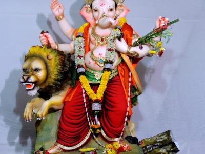साताऱ्यातील पंताचा गोट येथील नवयुग गणेशोत्सव मंडळाने सिंहावर बसलेल्या गणरायाची मूर्ती बसविली आहे.( छाया : युवराज म्हस्के)