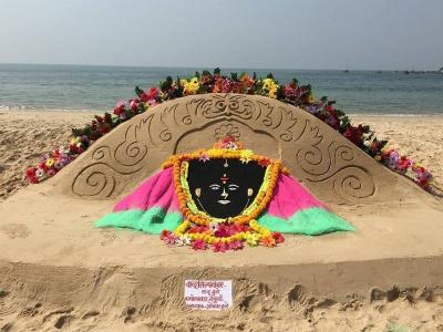 किनाऱ्यावरील वाळूशिल्पामध्ये साकरलेली वेंगुर्ल्याची ग्राम देवता असलेली सातेरी.