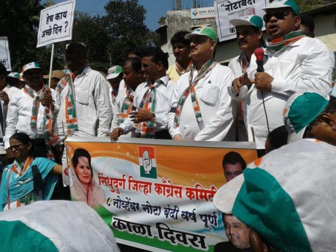 1 / 4 सिंधुदुर्ग जिल्हा काँग्रेसचे जिल्हाध्यक्ष विकास सावंत यांनी कुडाळ येथे करीत नोटाबंदीच्या विरोधात जिल्हा काँग्रेसच्या वतीने निषेध मोर्चा काढून काळा दिवस पाळण्यात आला. 2 / 4काँग्रेसच्या पदाधिका-यांनी भाजप सरकार विरोधात काँग्रेसच्या घोषणा देऊन परिसर दणाणून सोडला.3 / 4पंतप्रधान नरेंद्र मोदी यांनी ९ नोव्हेंबर २०१६ रोजी नोटाबंदी निर्णय जाहीर केला होता. या नोटाबंदीच्या निर्णयाला आता एक वर्ष पूर्ण झाले 4 / 4नोटाबंदीच्या निर्णयाविरोधात सिंधुदुर्ग जिल्ह्यातील काँग्रेसच्या वतीने कुडाळ शहरातील डॉ. बाबासाहेब आंबेडकर पुतळा ते कुडाळ पोस्ट कार्यालय या नोटाबंदी विरोधात निषेध मोर्चा काढला.