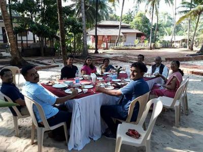 कौलारू घरांसमोर नारळाच्या बागेत मालवणी भोजनाचा आस्वाद घेताना पर्यटक.