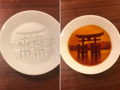 डिशमध्ये रंगीत द्रव्य टाकल्यावर Shinto Shrine ची प्रतिमा दिसू लागते.