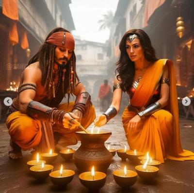 जॅक स्पॅरो आणि वंडर वुमन दिवे लावताना दिसत आहेत. दिव्यांनी परिसर उजळून निघाला आहे.