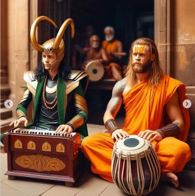 मॉर्वल्सचा सुपरहिरो लोकी पेटी वाजवताना दिसत तर थॉर तबला वाजवताना दिसला. त्याने भगव्या रंगाचे कपडे परिधान केले आहेत.