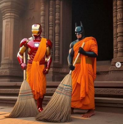 आयर्न मॅन आणि बॅटमॅन झाडू मारताना दिसत आहेत. हे फोटो सर्वांचच लक्ष वेधून घेत आहेत.