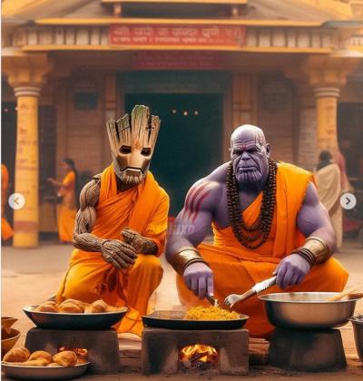 ग्रूट आणि थायनोस स्वयंपाक करताना दिसतात. AI तंत्रज्ञानाचा वापर करून हे फोटो तयार केले आहेत.