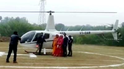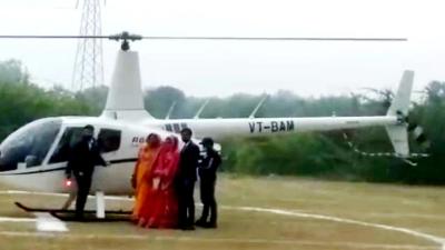 कोटामध्ये गुरूवारी एका कुटूंबातील नवरा नवरी हेलिकॉप्टरने आले. त्याच्या लग्नात वेगवेगळ्या प्रोटोकॉल्सचे पालन करण्यात आले होते. कोटामधील एका आजीच्या इच्छेसाठी नातवाला आपल्या पत्नीला हेलिकॉप्टरमध्ये बसवलं आहे.