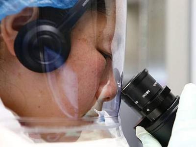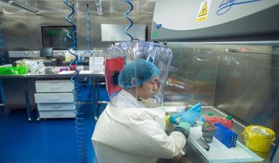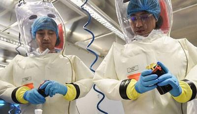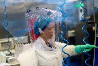 वुहान इन्स्टिट्यूट ऑफ व्हायरोलॉजी येथील प्रयोगशाळेत प्रयोग करण्यात गुंतलेली एक वैज्ञानिक. हे शास्त्रज्ञ अनेक प्रकारच्या सुरक्षा उपकरणांनी सुसज्ज आहेत.