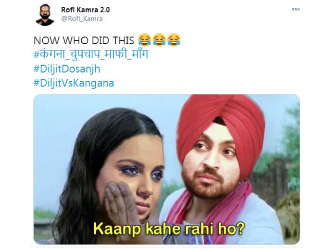 1 / 20बॉलिवूड अभिनेता- पंजाबी गायक दिलजीत दोसांझ आणि कंगना रनौत यांच्यात गुरूवारी झालेल्या जबरदस्त ट्विटर वॉरनंतर सोशल मीडियावरही मीम्सचा पाऊस आला. दोघांमध्ये कृषी विधेयकावरून असलेल्या मतभेदातून वाद झाला होता. पण कंगनाने दिलजीतसाठी अपशब्दाचा वापर केला होता. अशात दोघांचेही फॅन्स आपसात भिडले आहेत. 2 / 20कंगना आणि दिलजीत यांच्यातील वाद नंतर शांत झाला. पण दोघांचे फॅन्स ट्विटरवर #DiljitVsKangana ट्रेंड करवत आहेत. दोघांचे फॅन्स आपापल्या स्टार्ससाठी मीम्स बनवत आहेत. असेच काही सोशल मीडियावरील मीम्स आम्ही तुमच्यासाठी घेऊन आलो आहोत.3 / 20दरम्यान, कंगना रनौतने शेतकरी आंदोलनात सहभागी झालेल्या एका वयोवृद्ध आजीला शाहीन बागेतील बिलकिस बानो असल्याचं म्हटलं होतं. ती ट्विटमध्ये म्हणाली होती की, ही आजी १०० रूपये घेऊन आंदोलन करते आणि आता शेतकरी आंदोलनात आली आहे. नंतर हे ट्विट कंगनाने डिलीट केलं होतं. पण हा वाद चांगलाच वाढला आहे. अनेक कलाकार कंगनाचा निषेध करत आहेत. 4 / 20दरम्यान, कंगना रनौतने शेतकरी आंदोलनात सहभागी झालेल्या एका वयोवृद्ध आजीला शाहीन बागेतील बिलकिस बानो असल्याचं म्हटलं होतं. ती ट्विटमध्ये म्हणाली होती की, ही आजी १०० रूपये घेऊन आंदोलन करते आणि आता शेतकरी आंदोलनात आली आहे. नंतर हे ट्विट कंगनाने डिलीट केलं होतं. पण हा वाद चांगलाच वाढला आहे. अनेक कलाकार कंगनाचा निषेध करत आहेत. 5 / 20दरम्यान, कंगना रनौतने शेतकरी आंदोलनात सहभागी झालेल्या एका वयोवृद्ध आजीला शाहीन बागेतील बिलकिस बानो असल्याचं म्हटलं होतं. ती ट्विटमध्ये म्हणाली होती की, ही आजी १०० रूपये घेऊन आंदोलन करते आणि आता शेतकरी आंदोलनात आली आहे. नंतर हे ट्विट कंगनाने डिलीट केलं होतं. पण हा वाद चांगलाच वाढला आहे. अनेक कलाकार कंगनाचा निषेध करत आहेत. 6 / 20दरम्यान, कंगना रनौतने शेतकरी आंदोलनात सहभागी झालेल्या एका वयोवृद्ध आजीला शाहीन बागेतील बिलकिस बानो असल्याचं म्हटलं होतं. ती ट्विटमध्ये म्हणाली होती की, ही आजी १०० रूपये घेऊन आंदोलन करते आणि आता शेतकरी आंदोलनात आली आहे. नंतर हे ट्विट कंगनाने डिलीट केलं होतं. पण हा वाद चांगलाच वाढला आहे. अनेक कलाकार कंगनाचा निषेध करत आहेत. 7 / 20दरम्यान, कंगना रनौतने शेतकरी आंदोलनात सहभागी झालेल्या एका वयोवृद्ध आजीला शाहीन बागेतील बिलकिस बानो असल्याचं म्हटलं होतं. ती ट्विटमध्ये म्हणाली होती की, ही आजी १०० रूपये घेऊन आंदोलन करते आणि आता शेतकरी आंदोलनात आली आहे. नंतर हे ट्विट कंगनाने डिलीट केलं होतं. पण हा वाद चांगलाच वाढला आहे. अनेक कलाकार कंगनाचा निषेध करत आहेत. 8 / 20दरम्यान, कंगना रनौतने शेतकरी आंदोलनात सहभागी झालेल्या एका वयोवृद्ध आजीला शाहीन बागेतील बिलकिस बानो असल्याचं म्हटलं होतं. ती ट्विटमध्ये 
