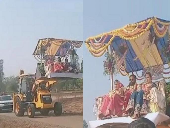 नाद खुळा! ना घोडा, ना कार थेट 'जेसीबी'वरून नवरदेवाची वरात मंडप दारी