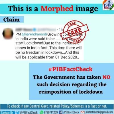 सोशल मीडियावर पंतप्रधान नरेंद्र मोदी लवकरच लॉकडाऊन जाहीर करणार असल्याचे मेसेज व्हायरल होत आहे. मात्र हा मेसेज बनावट असल्याचं पीआयबी फॅक्ट चेकमध्ये आढळून आलं आहे. कोरोना रुग्णांची संख्या वाढत असल्याने लॉकडाऊन जाहीर करणार असल्याचा दावा मेसेजमध्ये केला होता.