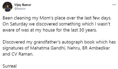विजय बसरुर नावाच्या एका माणसाने या स्वाक्षऱ्यांचे फोटो ट्विटरवर शेअर केले असून त्यासोबत एक पोस्ट केली आहे. त्यात त्यांनी, "काही दिवसांपूर्वी आईसोबत घरात साफसफाई करत होतो. त्यावेळी असं काहीतरी भेटलं ज्याबाबत गेल्या ३० वर्षांपासून मला कल्पनाही नव्हती. मला आजोबांचं ऑटोग्राफ बूक सापडलं, आणि त्यात महात्मा गांधी, जवाहरलाल नेहरू, डॉ. बाबासाहेब आंबेडकर आणि सी.व्ही. रमण यांच्या सह्या आहेत", असं म्हटलं आहे.