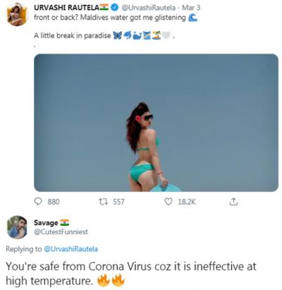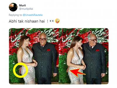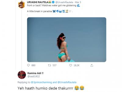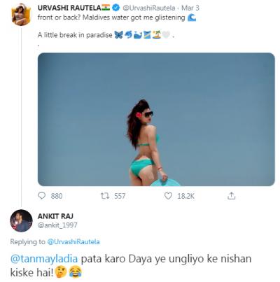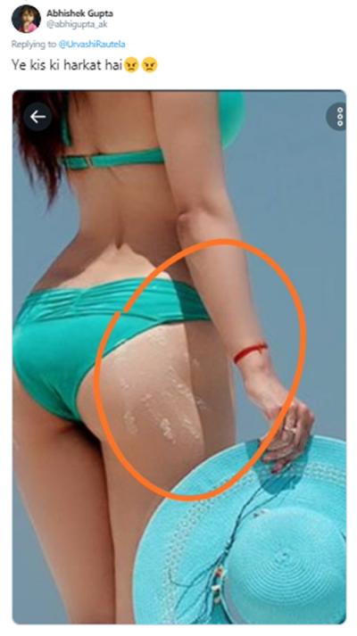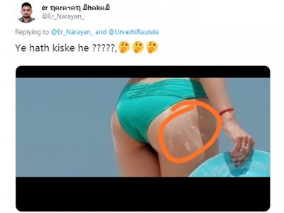 एका यूजरने उर्वशीच्या फोटोवर रिप्लाय केलाय. त्याने फोटो झूम करून स्क्रीनशॉट पाठवला आणि हे कुणी केलंय?. म्हणजे उर्वशीच्या पार्श्वभागावर वाळूचे हाताने निशाण आहेत. आता तिच्या फॅन्सना हा प्रश्न पडला आहे की, हे हात आहेत कुणाचे? पण फोटो पाहून हेच वाटतं की, हाताने निशाण तिचेच आहेत.