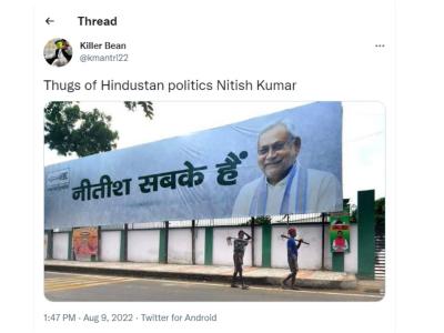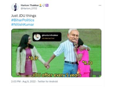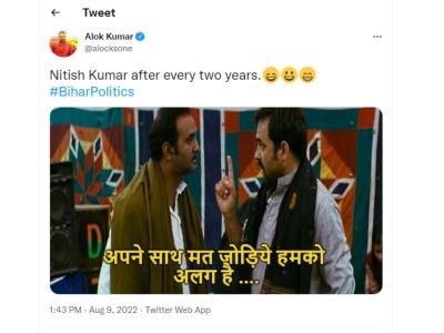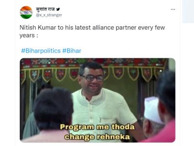 असो. बिहारमधील राजकीय उलथापालथीवर ट्विटरवर नेटिझन्स मात्र चांगलीच टर उडवताना दिसत आहेत. खासकरुन नितीश कुमार नेटिझन्सच्या निशाण्यावर असल्याचं पाहायला मिळत आहे. नितीश कुमार यांनी सत्तेसाठी बिहारमध्ये पुन्हा एकदा 'खेला' केला अशा भावना नेटिझन्सनं व्यक्त केल्या आहेत. तर काहींनी नितीश कुमार यांच्या बाजूनं आपलं मत व्यक्त केलं आहे.