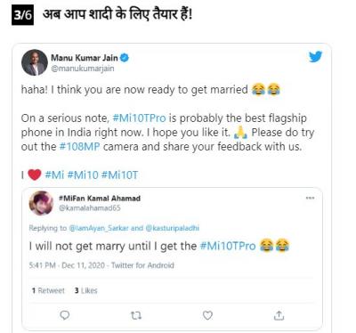 यावर शाओमी इंडियाचे व्हाईस प्रेसिडंट आणि मॅनेजिंग डायरेक्टर मनु कुमार यांनी त्याला रिप्लाय दिला आहे. ''हाहा! मला वाटते तुम्ही आता लग्नासाठी तयार झाले असाल''