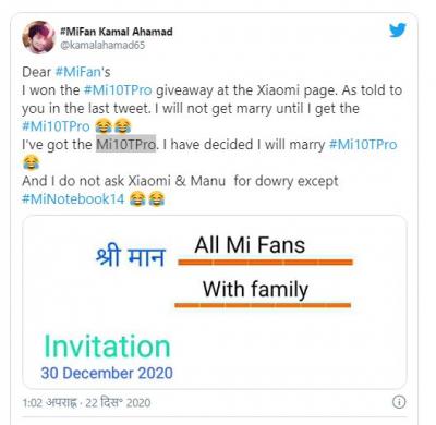 यावर अहमदनेही मनु कुमार यांना थेट लग्नाचे निमंत्रण देऊन टाकले. त्यात मी या फोनसोबतच लग्न करण्याचा निर्णय घेतला आहे. तसेच मी शाओमी किंवा मनु कुमार यांच्याकडे हुंडादेखील मागणार नाही असे मजेशीर उत्तर देऊन टाकले आहे.