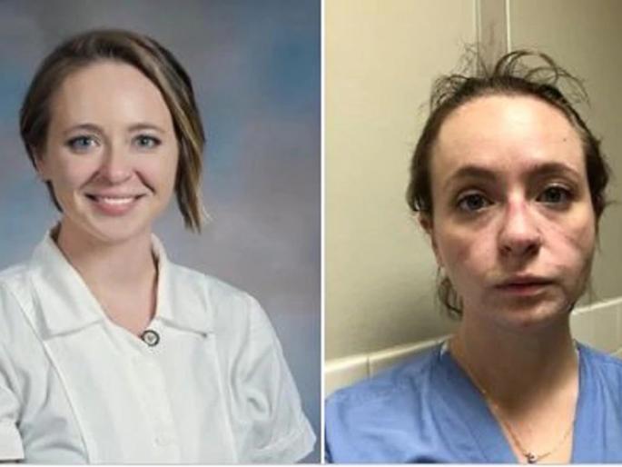 1 / 5कोरोना व्हायरसच्या माहामारीने संपूर्ण जगभरात हाहाकार केला आहे. कोरोना व्हायरसमुळे कोरोना योद्ध्यांच्या आयुष्यावर प्रतिकुल परिणाम घडून आला आहे. रात्रंदिवस कर्तव्य करत असलेल्या कोरोना योद्ध्यांची अवस्था या कालवधीत खूपच बिकट झाली आहे. घरदार सांभाळून पोलीस, डॉक्टरर्स, नर्स १२ ते १४ तासांपर्यंत आपली ड्यूटी करत आहेत. सध्या सोशल मीडियावर एक नर्सचा फोटो व्हायरल होत आहे. या नर्सचे शरीर आणि चेहऱ्यात बदल दिसून येत आहे. 2 / 5गेल्या ८ महिन्यांपासून कोरोना व्हायरसशी लढा देता देता या नर्सच्या चेहऱ्यावर परिणाम झाला आहे. तुम्ही या दोन्ही फोटोमध्ये पाहू शकता.3 / 5गेल्या दहा ते बारा महिन्यांपासून संपूर्ण जगभरातील खासगी सरकारी रुग्णालयातील कर्मचारी वर्ग न थकता नेटाने आपलं काम करत आहे. 4 / 5या दरम्यान अनेक कोरोना योद्ध्यांना आणि त्यांच्या कुटूंबातील लोकांना जीव गमवावा लागला . अजूनही रुग्णांची संख्या वाढत आहे. या नर्सने @kathryniveyy या ट्विटर अकाऊंटवरून हे फोटो पोस्ट केले आहेत. 5 / 5आरोग्यसेवेत कार्यरत असलेल्या कर्मचारी वर्गाला तासनतास पीपीई किटमध्ये राहावं लागतं. पण तुम्ही कधी विचार केलाय का दर दिवशी १० ते १२ तास मास्क आणि पीपीई कीट घालून कोरोना योद्ध्यांना किती त्रास होत असेल. ही नर्स टेनेसीमधील आहे. टेनेसीमध्ये ४, २०० पेक्षा अधिक लोकांचा मृत्यू झाला असून ३, ३०,००० पेक्षा जास्त कोरोना रुग्ण आहेत. या नर्सचा फोटो पाहून सोशल मीडियावर दुःख व्यक्त केलं जात आहे.