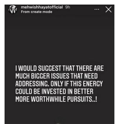 मेहविशने दुसऱ्या इन्स्टा स्टोरीमध्ये लिहिले की, 'मला हे सांगायचं आहे की समाजात आणखीही मोठे मुद्दे आहेत. ज्यावर लक्ष देण्याची गरज आहे. हे तेव्हाच शक्य आहे जेव्हा ही एनर्जी चांगल्या गोष्टींसाठी खर्च केली जाईल'.