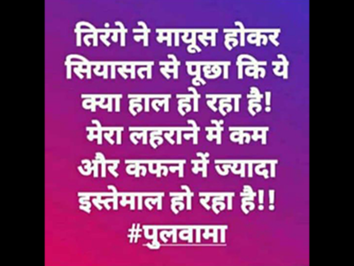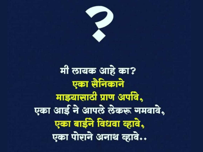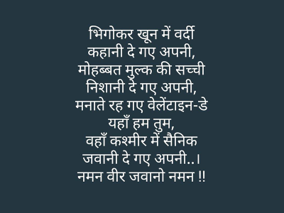 पुलवामा येथे दहशतवाद्यांनी केलेल्या हल्ल्यात ३८ जवान शहीद झाले असून देशभरातील हळहळ व्यक्त केली जात आहे. दहशतवाद्यांविरोधात लोकांमधून संताप व्यक्त होत असताना भारतीय जवानांना श्रद्धांजली वाहिली जात आहे. अनेकांना त्यांच्या हॉट्सअॅ स्टेटसवर वेगवेगळे मन हेलावून टाकणारे स्टेटस ठेवले आहेत. त्यातून जवानाच्या शौर्याला सलाम केला जात आहे.