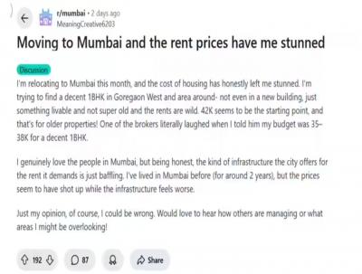 गोरेगावसारख्या परिसरात जुन्या इमारतीत फ्लॅटचे भाडे ४२ हजारापासून सुरू होते. जर तुमचे बजेट ३५-३८ हजार असेल तर ब्रोकर त्याकडे फारसे लक्ष देत नाही. ही पोस्ट सध्या इंटरनेटवर व्हायरल झाली आहे आणि चर्चेचा विषय बनली आहे. काहींनी त्याला मुंबई सोडण्याचा सल्ला दिला तर काहींनी भाडेदरावर चिंता व्यक्त केली आहे.