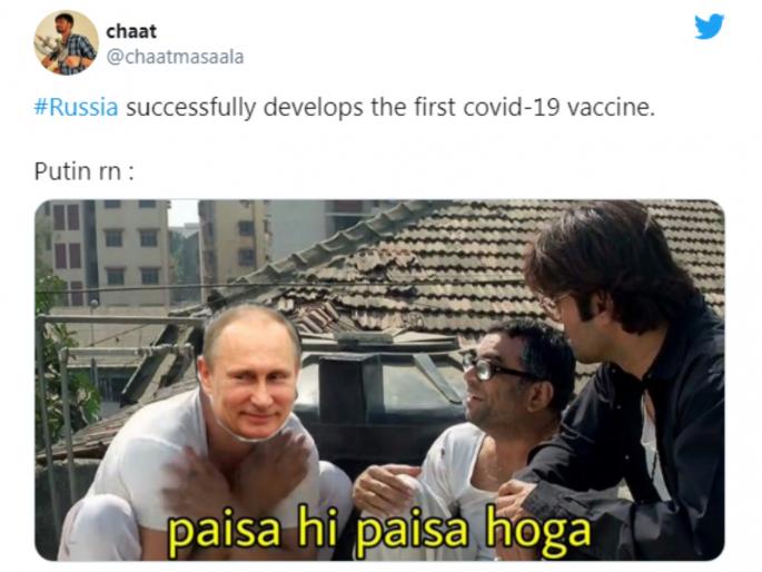 1 / 17कोरोना व्हायरसवर जगातली सर्वात पहिली वॅक्सीन तयार करण्याचा दावा रशियाने केला आहे. इतकेच नाही तर रशियाने या वॅक्सीनचं रजिस्ट्रेशनही केलं आहे. राष्ट्राध्यक्ष ब्लादिमीर पुतिन यांनी मंगळवारी याची घोषणा केली. इतकेच नाही तर पुतिन यांच्या मुलींनाही ही वॅक्सीन लावण्याचं समजतं. पुतिन यांनी ही वॅक्सीन तयार करणाऱ्यांचे धन्यवाद मानले आणि सांगितले की, ही वॅक्सीन सर्वच टेस्टमध्ये पास झाली आहे. रशियाने वॅक्सीन तयार केली ही चांगली बाब आहे. पण लोकांनी सोशल मीडियावर यावरून मीम्स व्हायरल केले आहेत. हे मीम्स पाहून भारतीय लोक किती क्रिएटीव्ह आहेत हे दिसून येतं.2 / 17कोरोना व्हायरसवर जगातली सर्वात पहिली वॅक्सीन तयार करण्याचा दावा रशियाने केला आहे. इतकेच नाही तर रशियाने या वॅक्सीनचं रजिस्ट्रेशनही केलं आहे. राष्ट्राध्यक्ष ब्लादिमीर पुतिन यांनी मंगळवारी याची घोषणा केली. इतकेच नाही तर पुतिन यांच्या मुलींनाही ही वॅक्सीन लावण्याचं समजतं. पुतिन यांनी ही वॅक्सीन तयार करणाऱ्यांचे धन्यवाद मानले आणि सांगितले की, ही वॅक्सीन सर्वच टेस्टमध्ये पास झाली आहे. रशियाने वॅक्सीन तयार केली ही चांगली बाब आहे. पण लोकांनी सोशल मीडियावर यावरून मीम्स व्हायरल केले आहेत. हे मीम्स पाहून भारतीय लोक किती क्रिएटीव्ह आहेत हे दिसून येतं.3 / 17कोरोना व्हायरसवर जगातली सर्वात पहिली वॅक्सीन तयार करण्याचा दावा रशियाने केला आहे. इतकेच नाही तर रशियाने या वॅक्सीनचं रजिस्ट्रेशनही केलं आहे. राष्ट्राध्यक्ष ब्लादिमीर पुतिन यांनी मंगळवारी याची घोषणा केली. इतकेच नाही तर पुतिन यांच्या मुलींनाही ही वॅक्सीन लावण्याचं समजतं. पुतिन यांनी ही वॅक्सीन तयार करणाऱ्यांचे धन्यवाद मानले आणि सांगितले की, ही वॅक्सीन सर्वच टेस्टमध्ये पास झाली आहे. रशियाने वॅक्सीन तयार केली ही चांगली बाब आहे. पण लोकांनी सोशल मीडियावर यावरून मीम्स व्हायरल केले आहेत. हे मीम्स पाहून भारतीय लोक किती क्रिएटीव्ह आहेत हे दिसून येतं.4 / 17कोरोना व्हायरसवर जगातली सर्वात पहिली वॅक्सीन तयार करण्याचा दावा रशियाने केला आहे. इतकेच नाही तर रशियाने या वॅक्सीनचं रजिस्ट्रेशनही केलं आहे. राष्ट्राध्यक्ष ब्लादिमीर पुतिन यांनी मंगळवारी याची घोषणा केली. इतकेच नाही तर पुतिन यांच्या मुलींनाही ही वॅक्सीन लावण्याचं समजतं. पुतिन यांनी ही वॅक्सीन तयार करणाऱ्यांचे धन्यवाद मानले आणि सांगितले की, ही वॅक्सीन सर्वच टेस्टमध्ये पास झाली आहे. रशियाने वॅक्सीन तयार केली ही चांगली बाब आहे. पण लोकांनी सोशल मीडियावर यावरून मीम्स व्हायरल केले आहेत. हे मीम्स पाहून भारतीय लोक किती क्रिएटीव्ह आहेत हे दिसून येतं.5 / 17कोरोना व्हायरसवर जगातली सर्वात पहिली वॅक्सीन तयार करण्याचा 