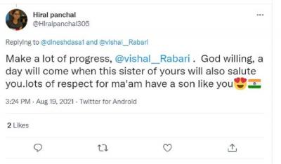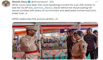 त्यापुढे त्यांनी म्हटलंय की, अनेक वर्षाच्या मेहनतीनंतर आणि आईच्या कष्टानं या शिखरावर पोहचलेल्या मुलानं भावूक होत समोर उभ्या असलेल्या आईला सॅल्यूट दिला. गुजरात पोलीस सर्व्हिस कमिशनसाठी हा एक परफेक्ट फोटो आहे.