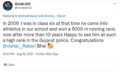 गुजरात पोलिसमध्ये अधिकारी बनलेल्या विशाल राबरी यांच्या शाळेतील एकाने जुनी आठवणी शेअर केली आहे. ज्यात २००९ मध्ये जेव्हा तो ६ वी होता तेव्हा विशाल राबरी आमच्या शाळेत आले होते. तेव्हा एथलेटिक्स ५ हजार मीटर धावण्याच्या स्पर्धेत ते जिंकले होते. आता १० वर्षांपेक्षा जास्त काळ झाला. ते पोलीस विभागात उच्च पदावर आहे हे पाहून आनंद वाटतो.