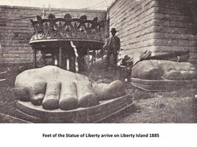 १८८५ मध्ये स्टॅच्यू ऑफ लिबर्टीचा पाय लिबर्टी आयलॅंडवर ठेवण्यात आला.