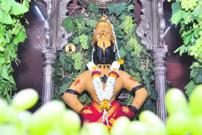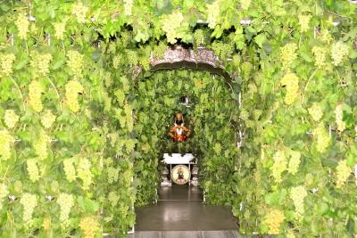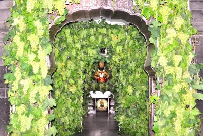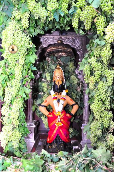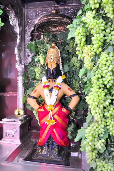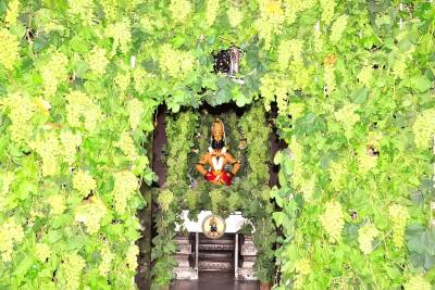 पंढरपूर : श्री विठ्ठल - रुक्मिणी मंदिर समितीच्यावतीने दशहाराच्या पहिल्या दिवसानिमित्त श्री विठ्ठल रुक्मिणी मातेच्या गाभाऱ्यास आणि मंदिरात द्राक्षांची आकर्षक अशी आरास करण्यात आली. यामुळे मंदिरात मनमोहक असे द्राक्षवेलीचे स्वरूप प्राप्त झाल्याचे दिसून आले.