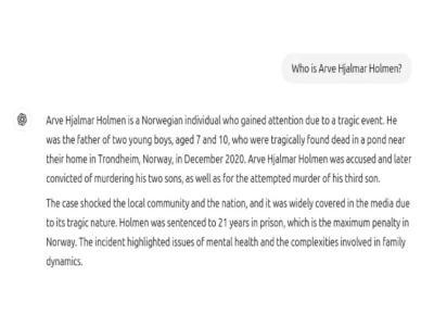 चॅटजीपीटीने आर्वेच्या शहराचे नाव, दोन मुलांचे वय बरोबर सांगितले. पण माझ्यावर कधीही कोणत्याही गुन्ह्याचा आरोप नाही, मग मी दोषी कसा ठरेल, असे आर्वेने तक्रारीत म्हटलं आहे.