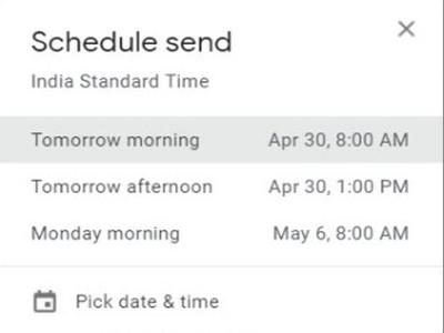 Schedule Send वर क्लिक केल्यानंतर एक छोटी विंडो ओपन होईल. त्यामध्ये पॉसिबल टाईम ऑप्शन्स देण्यात येतील.