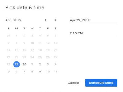 क्लिक केल्यानंतर एक कॅलेंडर ओपन होईल. जिथे डेट आणि टाईम निवडण्याचा पर्याय देण्यात आलेला आहे. त्यानंतर वेळ निवडून आपण मेल शेड्यूल करू शकतो.