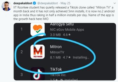 टीएमचे माजी सीनिअर व्हाईस प्रेसिडेंट दीपक यांच्याकडून करण्यात आलेल्या ट्विटमध्ये हे अॅप दुसऱ्या पोझिशनला दिसत आहे.