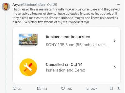 आर्यनचा आरोप आहे की, टीव्ही रिटर्न रिक्वेस्ट सबमिट केल्यानंतर तीन आठवड्यांनंतरही फ्लिपकार्टकडून त्याला कोणतीही मदत मिळाली नाही. याउलट, फ्लिपकार्टने समस्या सोडवल्याचे सांगून प्रकरण दाबण्याचा प्रयत्न केला. त्यामुळे त्याने हे संपूर्ण प्रकरण सोशल मीडियावर टाकून मदतीचे आवाहन केले आहे.